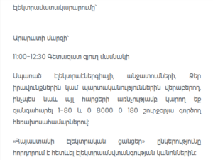 From 11:00 AM to 5:00 PM, electricity supply will be temporarily unavailable in the villages of Aruch, Shamiram, and Dprevank.