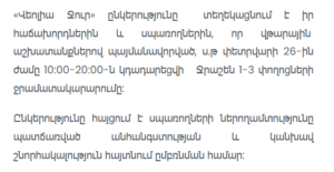 During this period, water supply will be unavailable on Jrashen 1st, 2nd, and 3rd Streets.