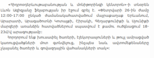 Levon Azizyan, Director of the Hydrometeorology and Monitoring Center, wrote on his social media page that strong winds are expected on February 26 between 12:00 PM and 5:00 PM in Yerevan and in certain areas of the Ararat, Aragatsotn, Kotayk, Shirak, Gegharkunik, and Syunik regions.