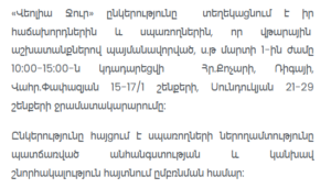 The company Veolia Jur informs its customers that due to emergency repair works, water supply will be temporarily suspended on March 1 from 10:00 AM to 3:00 PM at the following addresses in Yerevan: