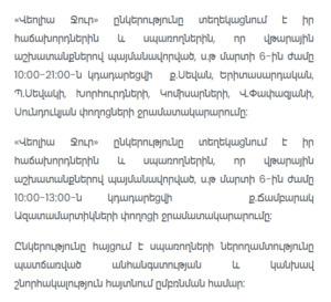 Water supply on Azatamartikner Street in Chambarak will be temporarily suspended from 10 00 to 13 00 on March 6 due to maintenance work Service is expected to resume after the scheduled works