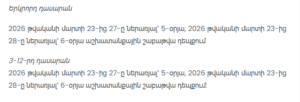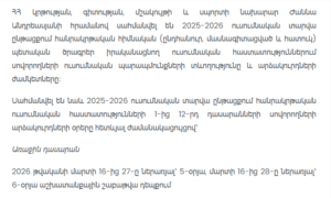By order of Armenia’s Minister of Education, Science, Culture and Sports, Zhanna Andreasyan, the schedule for lessons and school holidays for the 2025–2026 academic year has been officially approved.