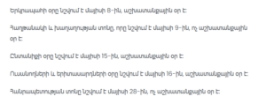 Armenia’s official holiday and working day schedule for late April and May includes several public holidays, observances, and adjusted working days.