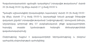 According to the company, gas service will be suspended from 9:00 AM on March 26 until 9:00 AM on March 27. The outage will affect the entire Noragavit district, as well as consumers located along Artashat Highway and residents of the apartment building at 127 Arshakunyats Avenue. Various nearby public and commercial facilities will also be impacted.