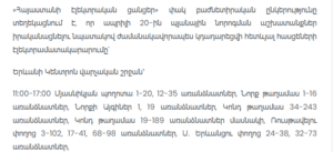 The Electric Networks of Armenia has announced planned power outages on April 20 due to maintenance works.