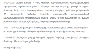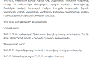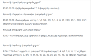 Kentron (11:00–17:00): Myasnikyan Ave., Nork districts, Kond, Rustaveli, S. Yerevantsi streets (partial)
