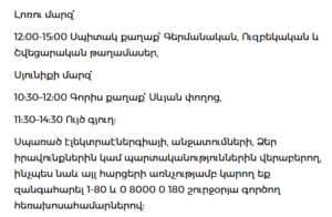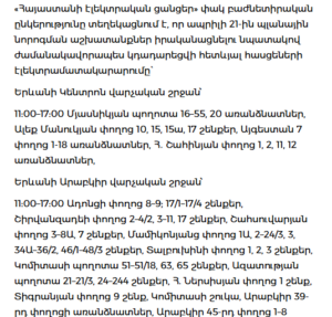 The Electric Networks of Armenia has announced scheduled power outages on April 21 due to maintenance works.