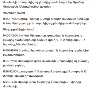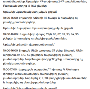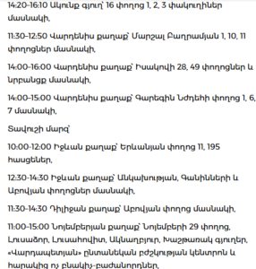 Kentron (11:00–17:00): Myasnikyan Ave., Alek Manukyan St., Aygestan, Shahinyan St.