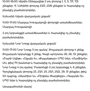Arabkir (11:00–17:00): Adonts, Shirvanzade, Mamikonyants, Komitas Ave., Azatutyan Ave., and surrounding areas