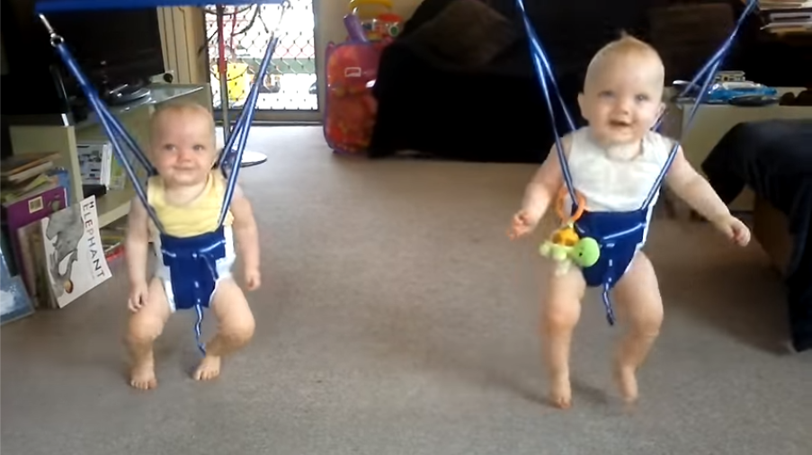 Watch the one on the left. The more he listens to the music, the more excited he gets, and he really starts moving across the floor. You can see their parents have cleared a big space for them to jump around. As I watched them jump and dance to the music, I started thinking they must be getting a pretty good workout in those jumpers. They are going to have really strong legs!