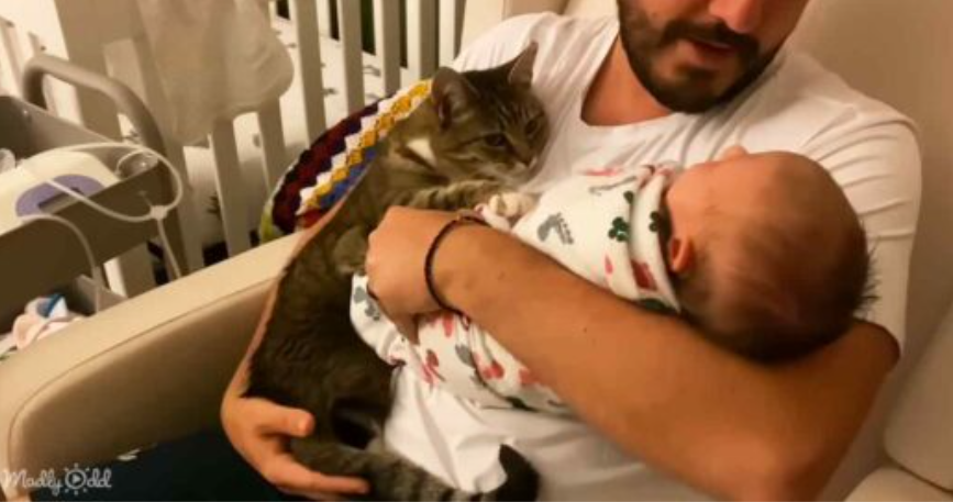 A cartoonist named Nick Fillippou took a video of his adorable rescue cat, Minnie meeting his new baby for the first time. At first, Minnie was a little afraid and nervous about the situation, but she slowly opened her heart to the baby. The video footage shows Minnie cuddling up against her mom’s baby bump and being a loving snuggle bug, and in the next scene, she meets her new baby sister.