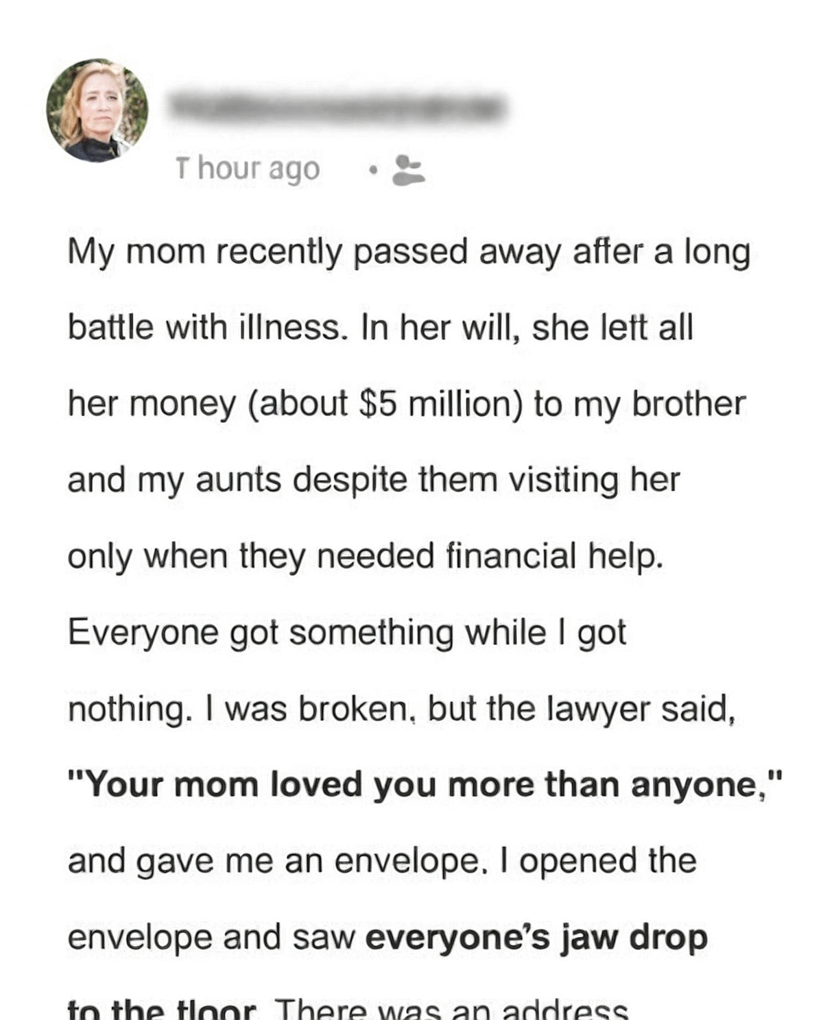 But then, a surprising twist changed everything. The lawyer handed me a sealed envelope. Inside was an address and a key. Intrigued, I set out to explore, and what I found left me speechless: a fully paid-for house. My mom had planned everything. In a heartfelt letter, she explained that she had known all along about my relatives’ reckless spending habits. The house was her way of ensuring my future, a place full of her love and presence. As for the money, she left it to them on purpose, believing they needed to learn the value of family over material wealth.
