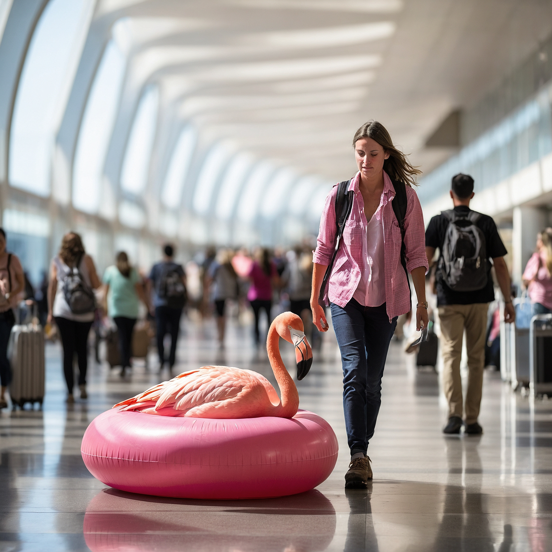 I never thought I’d find myself sprinting through an airport with a bright pink flamingo pool float