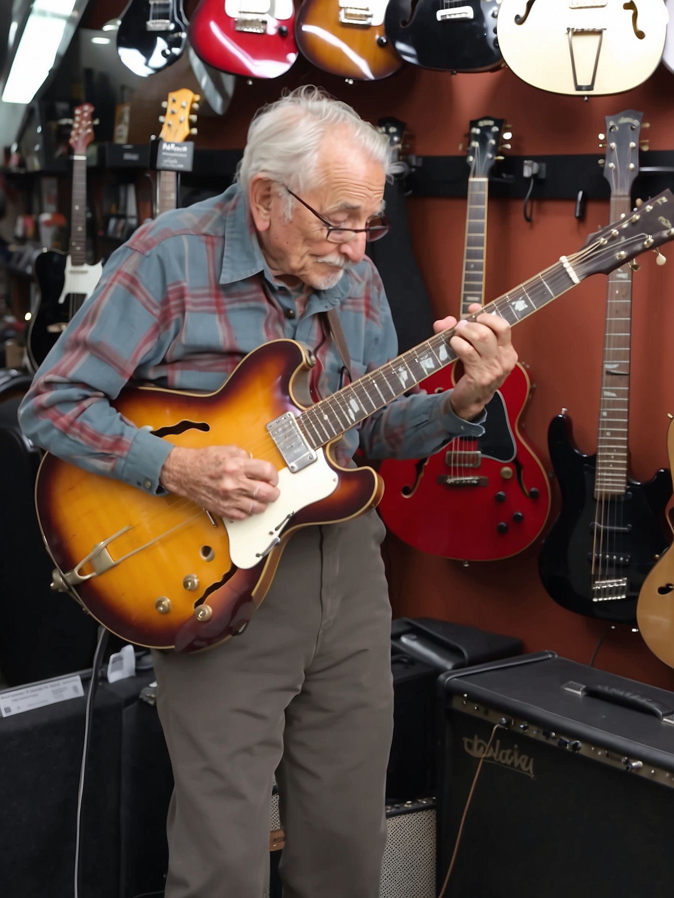 As the grandfather continues to strum, his eyes gently shut, immersing himself in the realm of melodies.